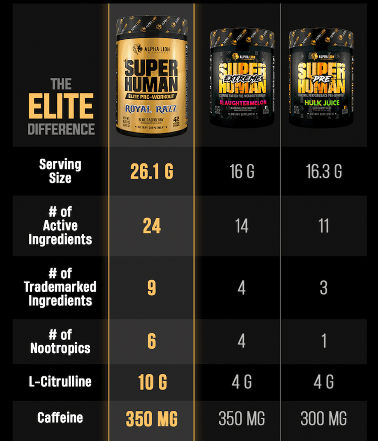 The newest and possibly the best we've seen...Alpha Lion's Super Human Elite Pre-Workout, the king of all pre-workouts! This limited edition formula boasts 24 active ingredients, including 10 G of L-Citrulline and 350 MG of caffeine, as well as 9 patented ingredients and 6 brain-boosting nootropics. Experience the ultimate elite performance with Alpha Lion.
